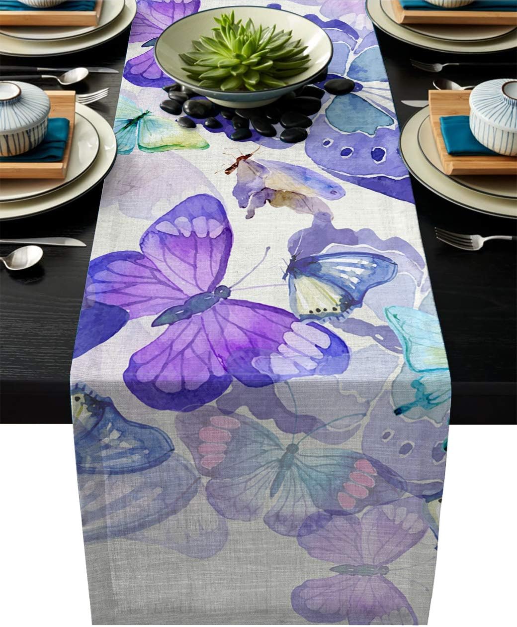 IDOWMAT Linen Burlap Table Runner Dresser Scarves 13 x 90 Inch, Watercolor Butterfly Purple Kitchen Table Runners for Farmhouse Dinner, Holiday Parties, Wedding, Events, Decor